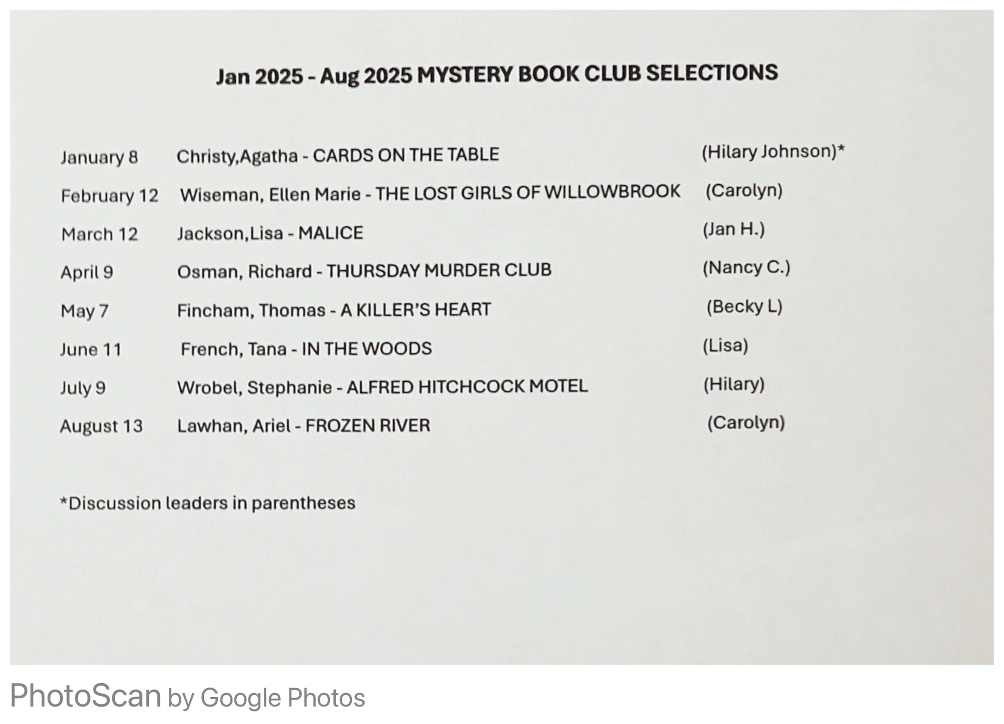 Lisa LeClerc is the Mystery Book Club Chair. You may contact her at Lisaleclercmn@gmail.com if you have any questions.
